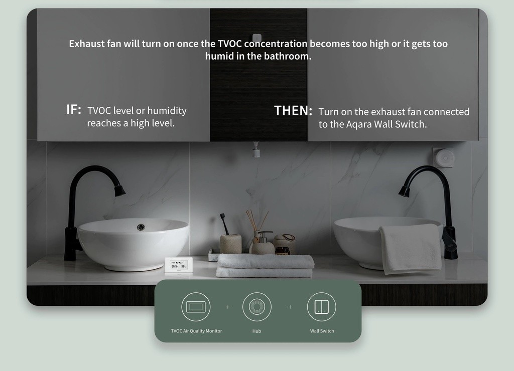 Cảm biến sẽ đo hàm lượng TVOC và báo thông tin đến thiết bị của bạn. Hub trung tâm sẽ đưa ra lệnh mở quạt, điều hòa,… của Aqara để giảm TVOC trong nhà bạn.